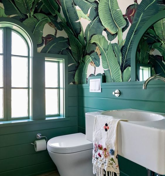 Martinique banana leaf wallpaper makes this gorgeous powder room.